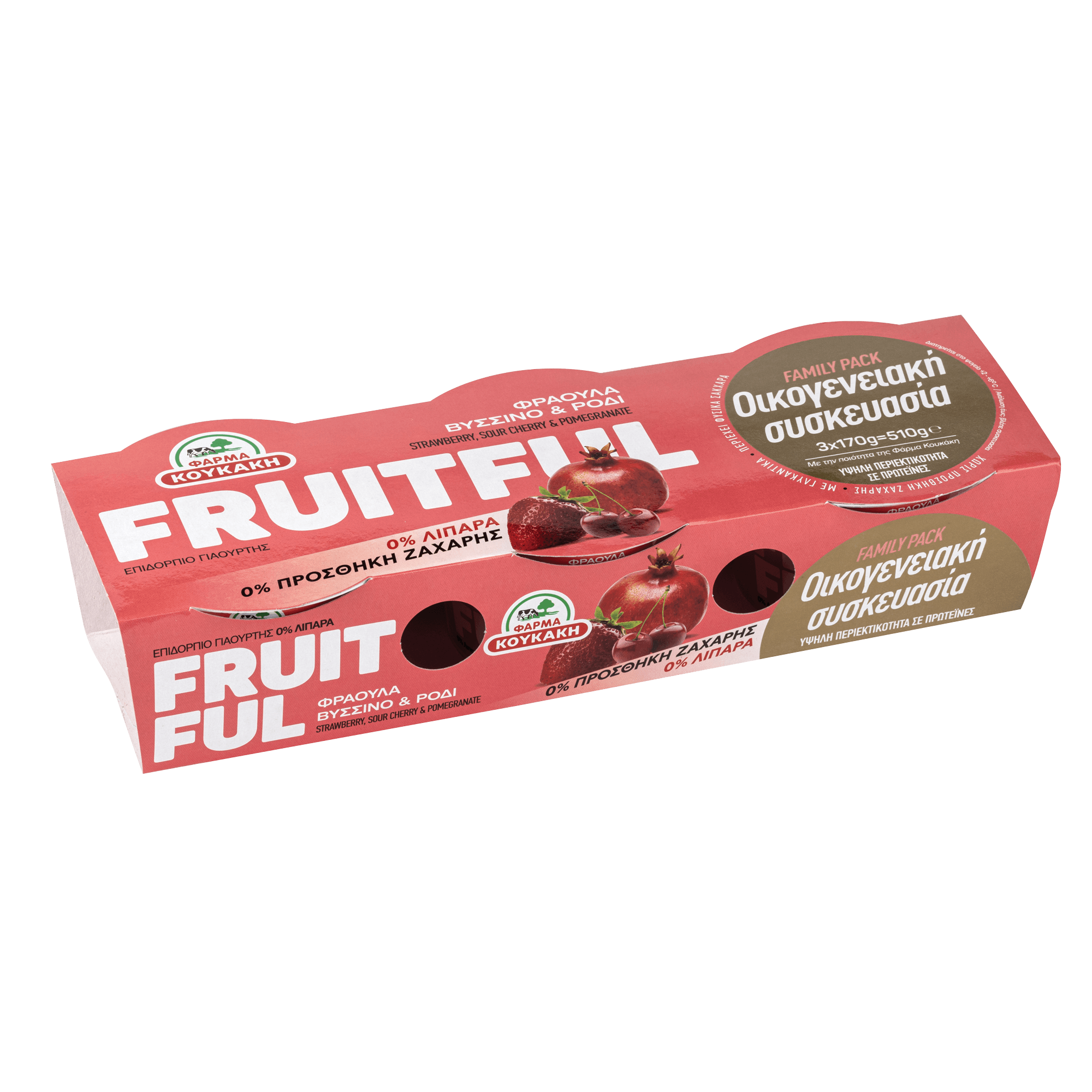 Strained yoghurt 0% fat with large pieces of fruits! Plummy combination of Strawberry, Sour Cherry and Pomegranate with zero-fat Greek yoghurt and min 25% fruit content.